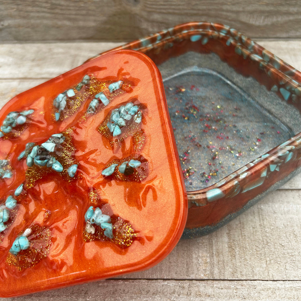 Thia resin box is 5" square and 2.25" tall. It is loaded with real Turquois nuggets.